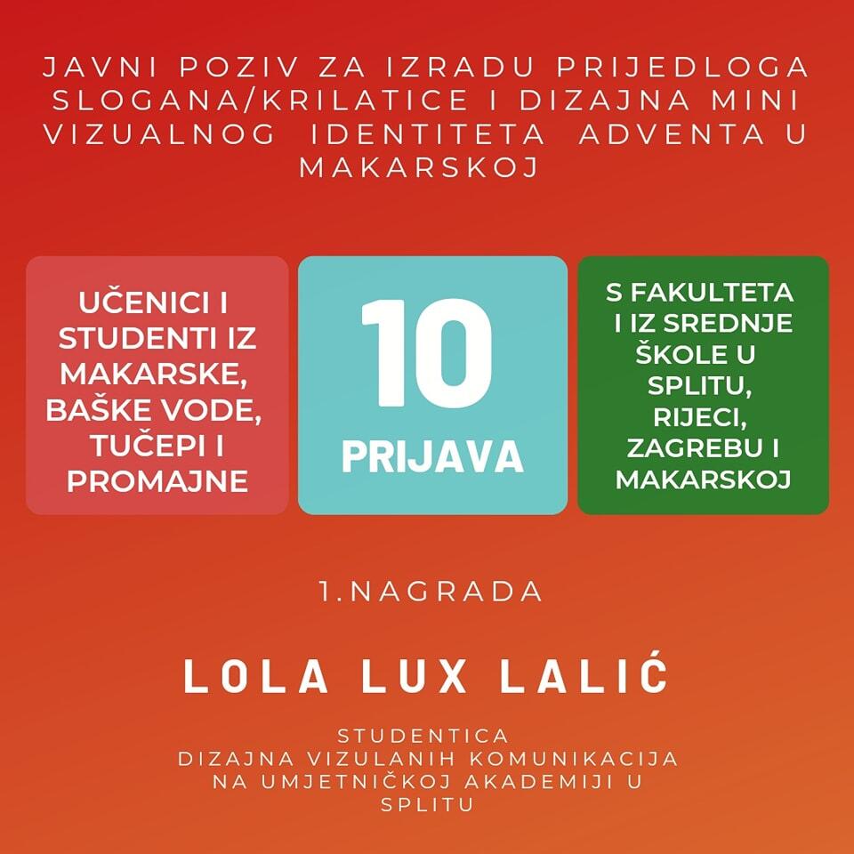 Na javni poziv za izradu prijedloga slogana/krilatice i dizajna mini vizualnog identiteta Adventa u Makarskoj pristiglo je 10 radova, a 3 prvonagrađena izabrao je žiri u kojem su sjedili Josip Karamatić, ravnatelj Galerije Antun Gojak, Tina Divić, vizualna umjetnica iz Umjetničkog studija Rintintina, Elenora Matijašević, dizajnerica vizualnih komunikacija iz Graphic studija Ella, Sandra Vranješ, pročelnica Upravnog odjela za javne potrebe i društvene djelatnosti i dogradonačelnica Antonia Radić Brkan.