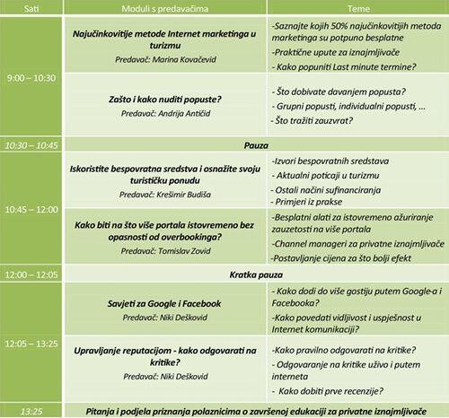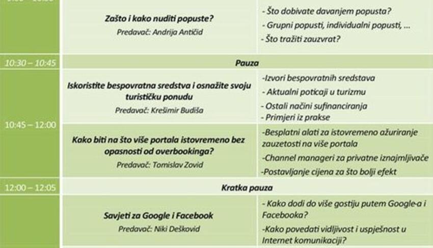 Glavne teme o kojima će se govoriti na edukaciji, a koje do sada nisu bile obrađivane na edukacijama, su poticaji u turizmu i internetska prodaja koja je vrlo bitna za poslovanje sve većeg broja novih privatnih iznajmljivača.