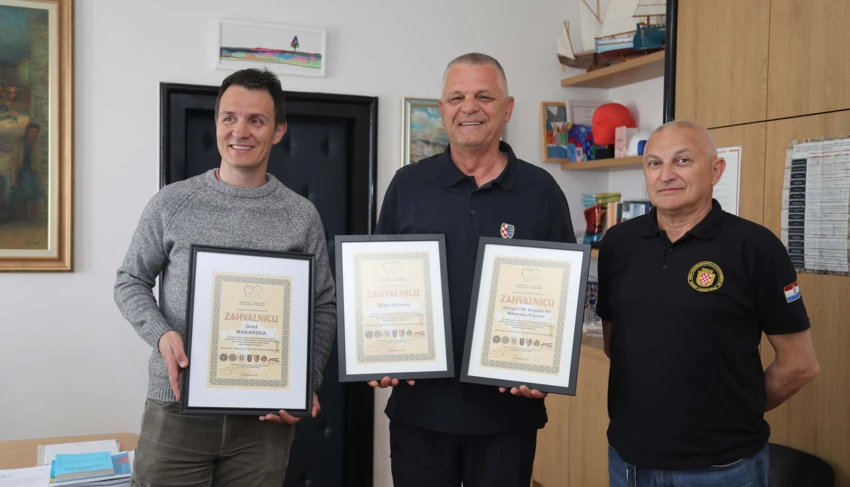 Predstavnici projekta Jedno srce - jedna duša od Vukovara do Dubrovnika jučer su u Gradu Makarskoj uručili zahvalnice gradonačelniku Zoranu Paunoviću, Stipi Kotarcu te Udruzi 156. brigade HV Makarska Vrgorac.