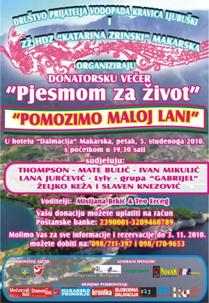 U petak, 5. studenog 2010., u hotelu Dalmacija s početkom u 19,30 sati održat će se donatorska večera za pomoć maloj Lani Penović.