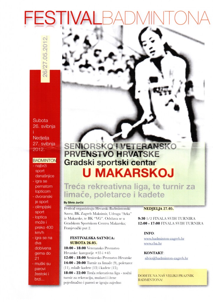 Od 26. do 27. svibnja u Gradskoj sportskoj dvorani održat će se Seniorsko i veteransko prvenstvo Hrvatske u badmintonu, a u organizaciji Udruge Arka iz Makarske, Hrvatskog badmintonskog saveza i BK Zagreb Maksimir. Prvoga dana turnira odigrat će se veteransko prvenstvo, te izlučna natjecanja Seniorskog prvenstva, turnira za najmlađe i kadete, te treća rekreativna liga uz noćni rekreativni turnir za žene i muškarce. Drugog dana održat će se polufinalna i finalna natjecanja. Inače, ovo je drugi po redu Festival badmintona koji se održava u Makarskoj u organizaciji Udruge Arka Makarska, a koja je članica Hrvatskog badmintonskog saveza.
