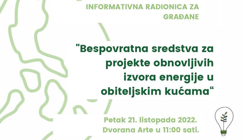 Cilj radionice je informiranje građana, vlasnika obiteljskih kuća o mogućnostima i uvjetima korištenja bespovratnih sredstava za ugradnju sustava za korištenje obnovljivih izvora energije: