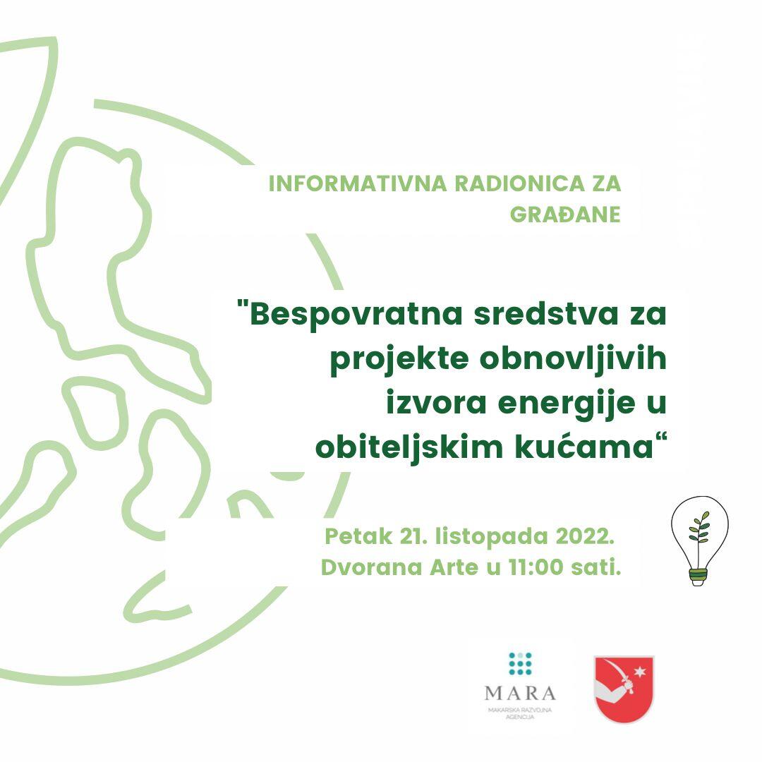 Grad Makarska i Javna ustanova Makarska razvojna agencija MARA organiziraju informativnu radionicu za građane „Bespovratna sredstva za projekte obnovljivih izvora energije u obiteljskim kućama“ koja će se održati u petak 21. listopada 2022. u dvorani Arte, s početkom u 11,00 sati.