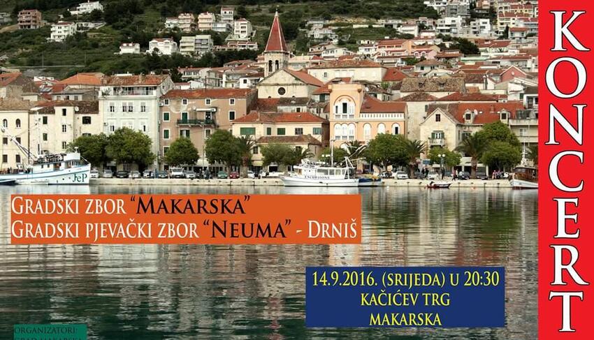Gradski zbor Makarska večeras će na Kačićevom trgu održati koncert s početkom u 20.30 sati. Gosti koncerta su pjevački zbor "Neuma" iz Drniša te dirigentica Jelena Prpa.