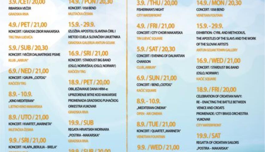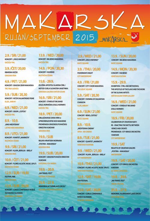 Spuštanje zastave Makarskog kulturnog ljeta ne znači da time prestaju događanja u gradu – sasvim suprotno, ovaj rujan će ih biti prepun a čekaju nas koncerti, izložbe, sportski događaji te još dva festivala. Što se tiče glazbenih događanja, već je sutra (2.rujna) na Kačićevom trgu koncert Disco Inferna a do kraja mjeseca, između ostalog, slijede i Večer dalmatinske pisme u Arbunu (5.rujan), koncerti klapa Berulia (9.rujan), makarskog Big Banda (13.rujan), norveškog Stardust Big Banda iz Osla (16.rujan), kao i nastup Gradskog puhačkog orkestra iz Vukovara (19.rujan). Od kulturnih događanja, nadalje, valja izdvojiti otvaranje izložbe ‘Apostoli Slavena Ćiril i Metod i djela slovačkih umjetnika” 15.rujna u Galeriji Gojak, kao i nastavak programa Kina Mediteran (7.-8. rujna), dok se iz sportskih najava izdvaja tradicionalna Regata hrvatskih mornara 20.rujna. Tekući mjesec donijet će i dva festivala, drugo izdanje lani pokrenutog Festivala ribe (11. i 12.rujna) te Ma Travel Fest, koji bi se trebao održati 20. i 21. rujna. Naravno, i ove će godine na Dan hrvatske ratne mornarice, 18.rujna, biti odigrana rekonstrukcija povijesne bitke protiv Mlečana.