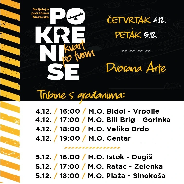 Grad Makarska u četvrtak 4. prosinca i petak 5. prosinca organizira tribine s građanima u sklopu projekta participativnog budžetiranja „Kvart po tvom“, na kojima će stanovnici pojedinih mjesnih odbora glasovanjem odlučiti koji će se prijedlozi malih komunalnih akcija uvrstiti u proračun za 2026. godinu.