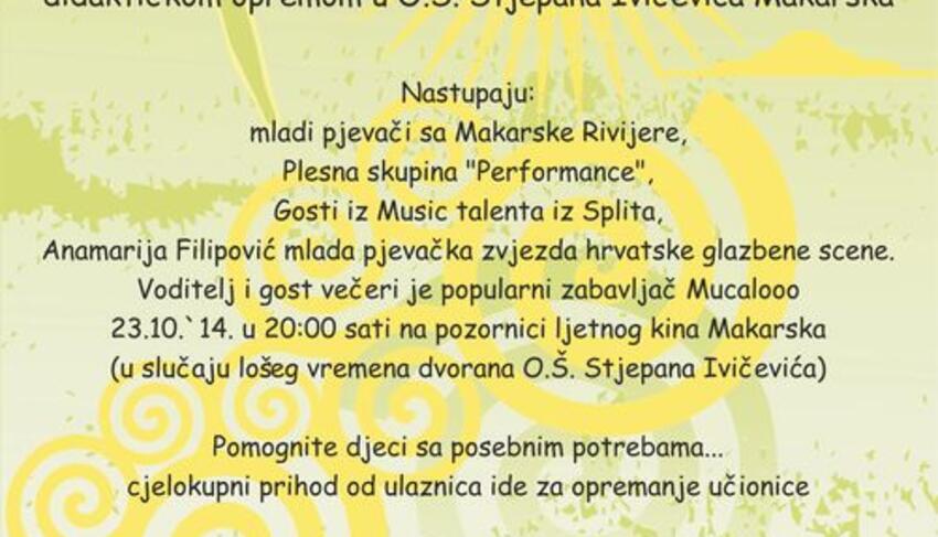 Prvi pljesak Makarske rivijere 2014., koji je sastavni dio proslave Dana Grada Makarske, zbog loše vremenske prognoze neće se održati, kako je najavljeno, na pozornici Ljetnog kina već u Osnovnoj školi Stjepana Ivičevića. Na tradicionalnoj dječjoj manifestaciji nastupaju mladi pjevači s Makarske rivijere, plesna skupina Performance, gosti iz Music talenta iz Splita i Anamarija Filipović. Voditelj i gost večeri je popularni zabavljač Mucalo. Riječ je o humanitarnom koncertu čiji je prihod namijenjen kupnji didaktičke opreme za opremanje učionice u Osnovnoj školi Stjepana Ivičevića. Podsjetimo, Prvi pljesak Makarske rivijere održava se 23. listopada( četvrtak) s početkom u 20,00 sati.