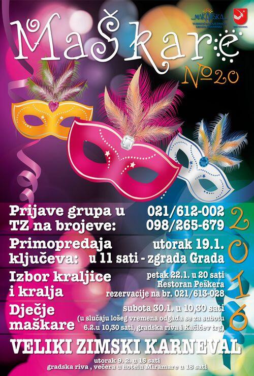 U Gradu Makarskoj i Turističkoj zajednici počele su pripreme za pokladne dane čiji će se vrhunac odigrati u utorak 9. veljače kada će na gradskoj rivi biti održan tradicionalni Zimski karneval, 20. po redu. Pokladna događanja započinju u utorak, 19. siječnja u 11,00 sati primopredajom ključeva pred zgradom Grada. Izbor kraljice i kralja slijedi u petak 22. siječnja u 20,00 sati u restoranu Peškera, dok je povorka dječjih maškara planirana za subotu 20. siječnja, u 10,30 sati na gradskoj rivi i Kačićevu trgu. U slučaju lošeg vremena za rezervni termin određena je subota 6. veljače, dok satnica i mjesto događanja ostaju nepromijenjeni. Sve grupe zainteresirane za Zimski karneval mogu se prijaviti u Turističkoj zajednici, ili na telefone 021/ 612-002 te 098 265-679, dok se rezervacije za večer Izbora kraljice i kralja maškara mogu obaviti pozivom na telefonski broj 021/ 613-028. Zimski karneval počinje 9. veljače u 15,00 sati okupljanjem maškara, a večera u hotelu Miramare slijedi od 18,00 sati.