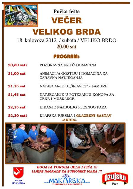 I ove godine Velobrđani organiziraju feštu mista – Noć Velikog Brda. Noć Velikog Brda je pučka fešta u čijoj organizaciji sudjeluju svi mještani i koja privuče veliki broj turista, a nadamo se da će tako biti i u subotu – 18. kolovoza. Velobrđani su nam najavili iće, piće, igre, pjesmu i ples, sve što treba za odličan provod. Na programu će se naći razne igre – „šijavica“, potezanje konopa za žene i muškaarce, biranje najboljeg plesnog para – za čije se bogate nagrade pobrinula Turistička zajednica. Za glazbeni dio večeri zadužena je Grupa Adria.