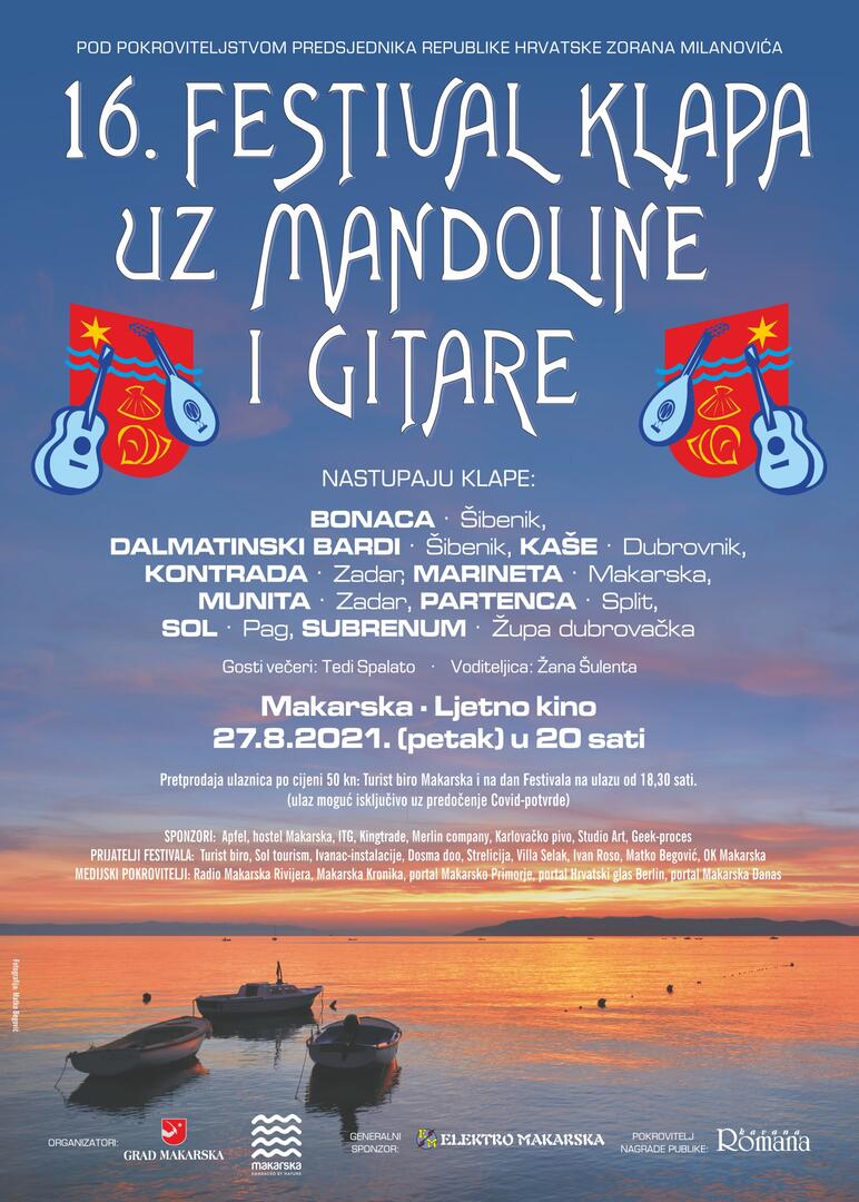 Festival klapa uz mandoline i gitare održat će se u petak 27. kolovoza u Ljetnom kinu s početkom u 20 sati. Ove godine predstavit će se devet klapa: Sol, Dalmatinski bardi,Kontrada, Marineta, Partneca, Subrenum, Bonaca, Kaše i Munita, a gost večeri bit će Tedi Spalato. Voditeljica festivala je Snježana Šulenta.