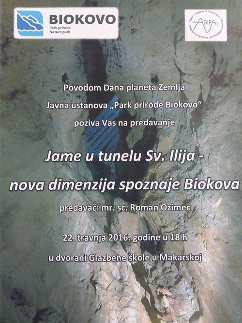 U povodu Dana planeta Zemlja Javna ustanova „Park prirode Biokovo" organizira predavanje mr.sc. Romana Ozimeca pod nazivom „Jame u tunelu Sv.Ilija – nova dimenzija spoznaje Biokova". Predavanje će se održati u prostorijama Glazbene škole u Makarskoj s početkom u 18 sati, 22. travnja 2016. godine.