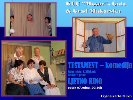 U petak 7. rujna Grad Makarska ugostit će KUU „Mosor“ iz Gata s komedijom „Testament“, autora V. Kljakovića u režiji T. Jurkovića. Predstava će se održati na pozornici Ljetnog kina, a ulaznice se mogu kupiti prije početka predstave na blagajni Ljetnog kina po cijeni od 30 kuna.