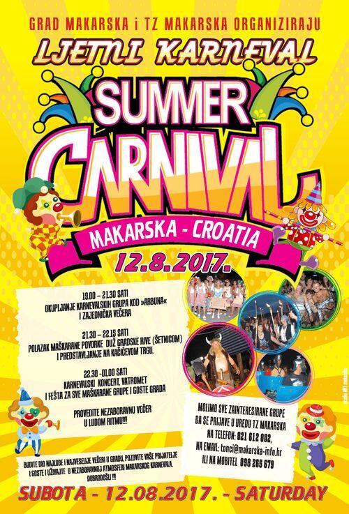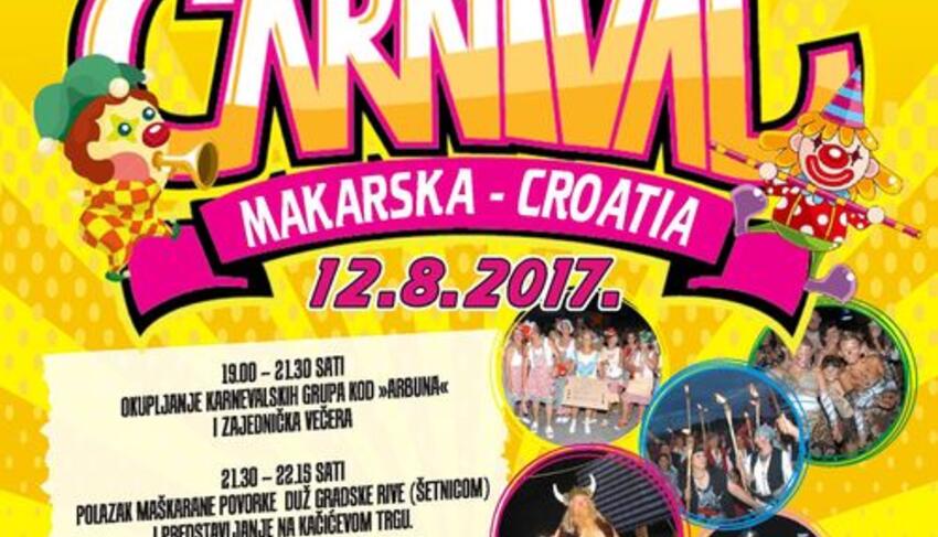 Tradicionalni makarski Ljetni karneval ove će se godine održati 12. kolovoza, a iz Turističke zajednice grada Makarske pozivaju sve zainteresirane udruge i pojedince da se prijave te budu dio jedne od najveselijih ljetnih večeri ove sezone u gradu. Prema najavljenom rasporedu, karnevalska događanja počinju od 19 sati ispred PŠRD Arbuna gdje će se održati okupljanje i zajednička večera svih prijavljenih grupa, nakon čega će maškarana povorka krenuti prema rivi s krajnjim odredištem na Kačićevu trgu. Tamo će zatim biti predstavljene sve ovogodišnje grupe, a nakon toga, u 22,30 sati započinje službeni karnevalski program uz feštu, prigodni koncert te nezaobilazni vatromet.