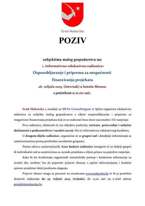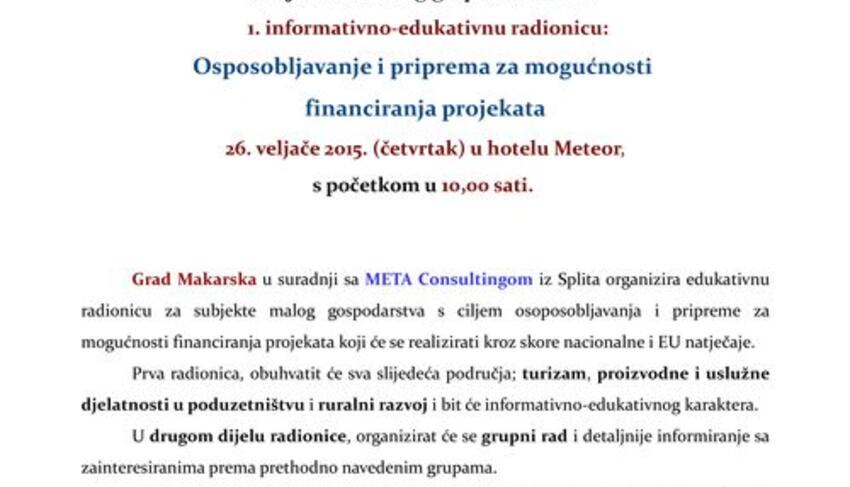 Grad Makarska u suradnji sa META Consultingom organizira edukativnu radionicu za subjekte malog gospodarstva s područja grada Makarske s ciljem osposobljavanja i pripreme za mogućnosti financiranja projekata, koji će se realizirati kroz skore natječaje iz programa Ministarstva obrta i poduzetništva (Poduzetnički impuls i dr.), Ministarstva turizma i Hrvatske turističke zajednice kao i iz Programa ruralnog razvoja 2014. – 2020. te Europskog fonda za regionalni razvoj, naročito za financiranje projekata kroz OP Konkurentnost i kohezija ("Izgradnja proizvodnih kapaciteta i ulaganje u opremu", "Ulaganje u proizvodnu tehnologiju", te "Ulaganja u turizam").