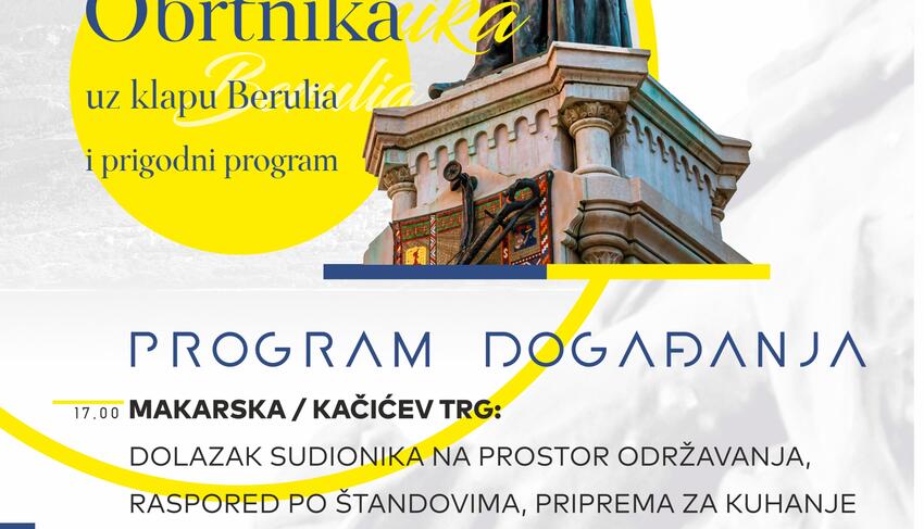 Gastro program za građane, koji uključuje prezentaciju specijaliteta udruženja obrtnika iz Zagrebačke, Krapinsko-zagorske, Vukovarsko-srijemske i Splitsko-dalmatinske županije, na rasporedu je od 19 do 21 sat. Od 20 sati posjetitelji će imati priliku pogledati modnu reviju Olje Luetić, talentirane makarske dizajnerice koja je svoju modnu kolekciju prošle godine predstavila i na londonskom fashion weeku te reviju frizura Udruženja obrtnika Makarska. Za glazbenu kulisu prve večeri obrtnika u Makarskoj pobrinut će se klapa Berulia.