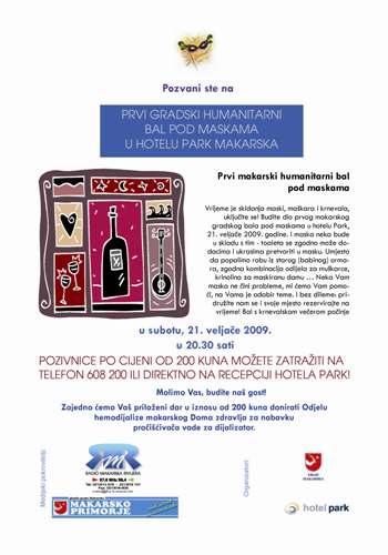 -Vrijeme je skidanja maski, maškara i karnevala, uključite se! Budite dio prvog makarskog gradskog bala pod maskama u hotelu Park. I maska neka bude u skladu s tim – toaleta se zgodno može dodacima i ukrasima pretvoriti u masku. Umjesto da popalimo robu iz starog (bakinog) ormara,načinimo zgodnu kombinaciju odijela za muškarce, krinolina za maskiranu damu... Neka Vam maska ne čini probleme, mi ćemo Vam pomoći, na Vama je odabir teme. I bez dileme: pridružite nam se i svoje mjesto rezervirajte na vrijeme! Bal s karnevalskom večerom počinje u subotu 21. veljače 2009. u 20,30 sati.
