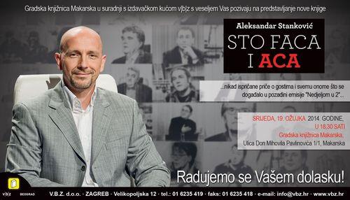 Zahvaljujući suradnji Gradske knjižnice i izdavačke kuće V.B.Z., u Makarskoj će u srijedu 19. ožujka gostovati ugledni televizijski novinar, urednik i voditelj Aleksandar Stanković. Ovom prigodom Stanković će Makaranima predstaviti svoju knjigu 'Sto faca i Aca' kroz koju će i lokalna publika imati prilike iz prve ruke doznati brojne detalje sa snimanja popularne emisije Nedjeljom u dva. Promociju knjige koja započinje u 18,30 sati u dvorani Glazbene škole vodit će novinarka Ivanka Šuta.