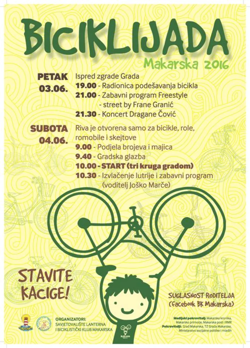 U organizaciji Savjetovališta Lanterna i Biciklističkog kluba Makarska 4. lipnja na gradskoj rivi održat će se 14. po redu Biciklijada, najveća manifestacije ove vrste u Hrvatskoj. Pokrovitelji su Grad Makarska, Turistička zajednica grada Makarske i Ministarstvo socijalne politike i mladih.