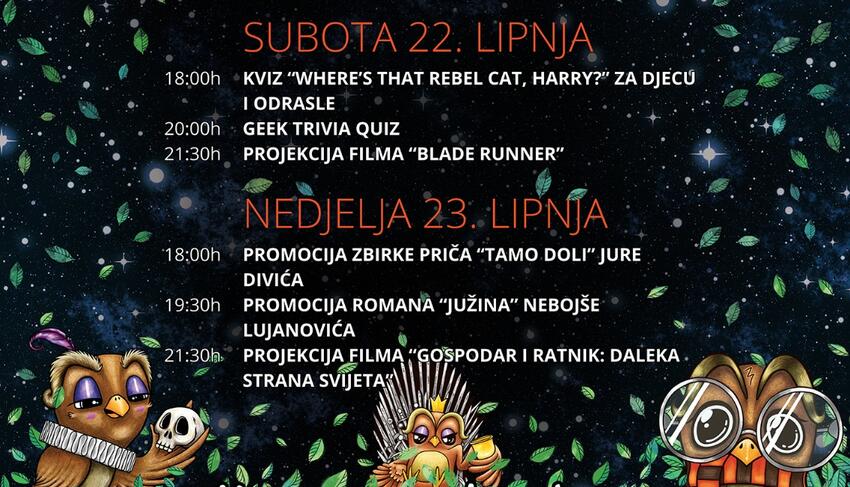 Prvi dan ispunjen je radionicama za djecu, likovnom pod vodstvom akademske slikarice Ivane Glibote Pandžić i filmskom „Mala škola filmskog stvaralaštva“ pod vodstvom režisera Ivana Perića. Subota je rezervirana za ljubitelje znanstvene fantastike. U goste nam dolazi Udruga za fantastiku, igre i znanstvenu fantastiku F&ST iz Splita, koja će održati kvizove na temu Harry Pottera, Garfielda i junaka iz Star Warsa. Za ozbiljnije šumotekine znalce tu je i Geek Trivia Quiz.