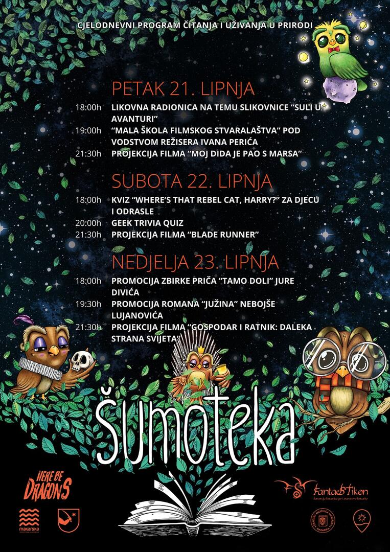 Ako si u potrazi za nečim drugačijim, a da to nije samo zabava, Šumoteka ti nudi spoj knjige, znanja i opuštanja. Manifestacija koja promovira kulturu čitanja i važnost boravka u prirodi prebacit će te u neku drugu dimenziju; kakvu dosad nisi imao prilike vidjeti u gradu podno Biokova.