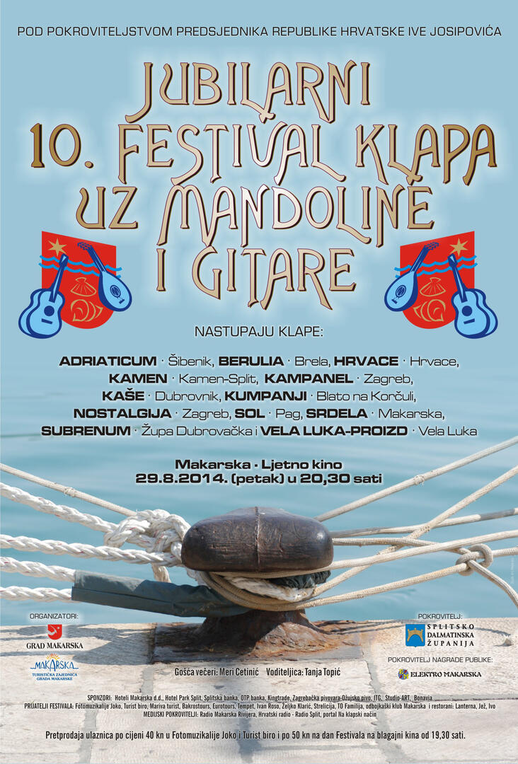 Makarska će u petak biti meka za sve ljubitelje dobre klapske pjesme. U gradu pod Biokovom održava se jubilarni 10. Festival klapa uz mandoline i gitare na pozornici Ljetnog kina s početkom u 20.30 sati. Ove godine nastupaju klape: Adriaticum iz Šibenika, Berulia iz Brela, Hrvace iz Hrvaca, Kamen iz Splita, Kampanel iz Zagreba, Kaše iz Dubrovnika, Kumpanji iz Blata na Korčuli, Nostalgija iz Zagreba, Sol iz Paga, Srdela iz Makarske, Subrenum iz Župe dubrovačke i klapa Vela Luka-Proizd iz Vele Luke. Program će voditi Tanja Topić, a gošća večeri je Meri Cetinić. Jubilarni Festival klapa uz mandoline i gitare održava se pod pokroviteljstvom predsjednika Republike Hrvatske Ive Josipovića i Splitsko- dalmatinske županije, a organizator je Grad Makarska i TZ grada Makarske. Pokrovitelj nagrade publike je Elektro Makarska. Pretprodaja ulaznica po cijeni od 40 kn je u Fotomuzikalijama Joko i Turist birou i po 50 kn na dan Festivala na blagajni Ljetnog kina od 19,30 sati. Kao i svake godine, sve je pravovremeno organizirano i pripremljeno, samo još da ne padne kiša, kaže Vedran Buble, alfa i omega Festivala klapa uz mandoline i gitare čijom se zaslugom do danas održao i postao nezamjenjivi dio Makarskog kulturnog ljeta. U povodu jubilarnog slavlja, tijekom ovogodišnjeg Makarskog kulturnog ljeta nastupile su nagrađene festivalske klape. I u desetoj godini forma Festivala ostaje ista. Dvanaest klapa natječe se za standardna priznanja, najavljuje Vedran Buble, direktor Festivala klapa uz mandoline i gitare.