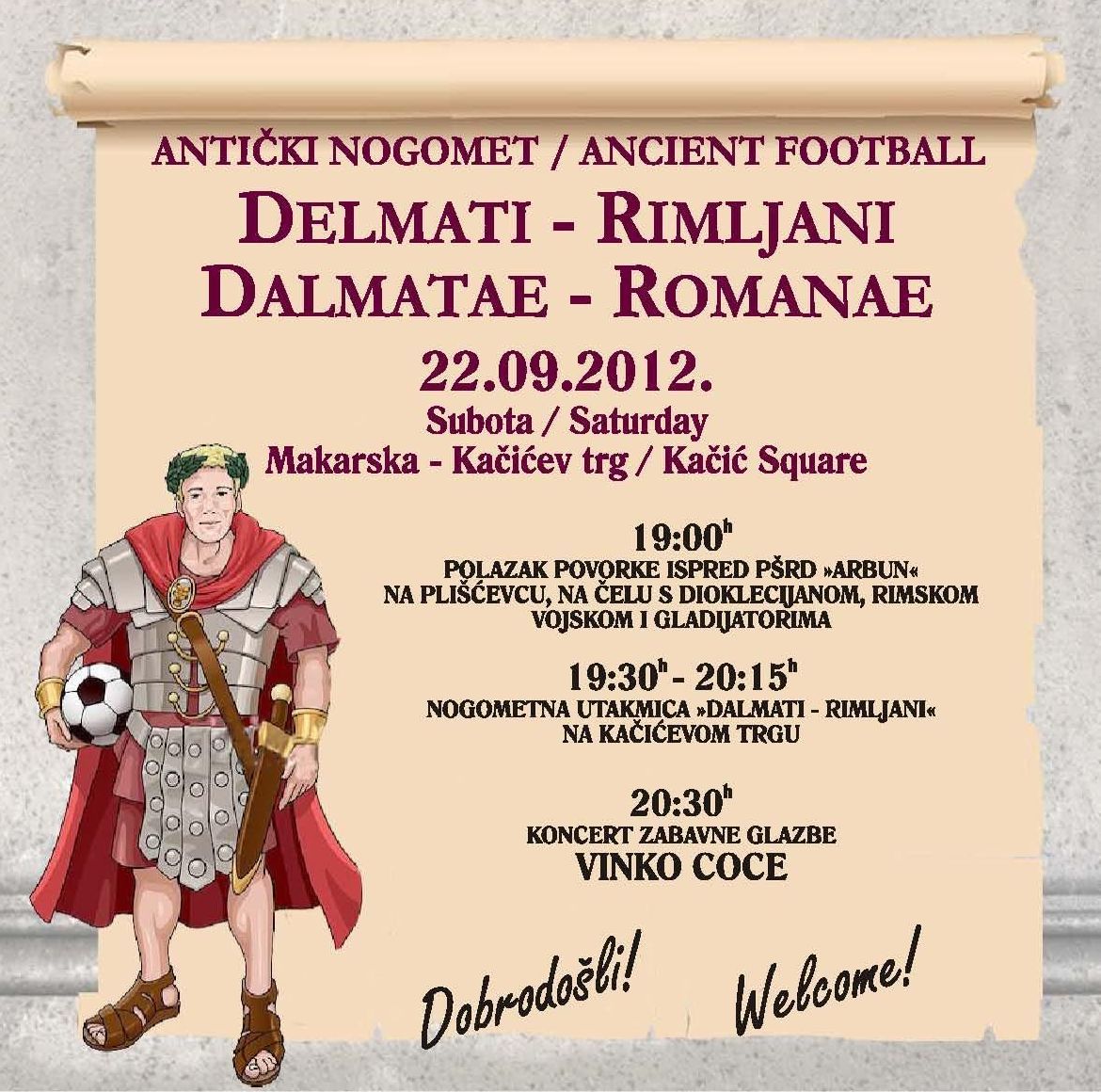 Turistička zajednica Grada Makarske u subotu 22. rujna 2012. organizira jedinstvenu manifestaciju- antički nogometni spektakl između DELMATA i RIMLJANA, a nakon toga koncert VINKA COCE!