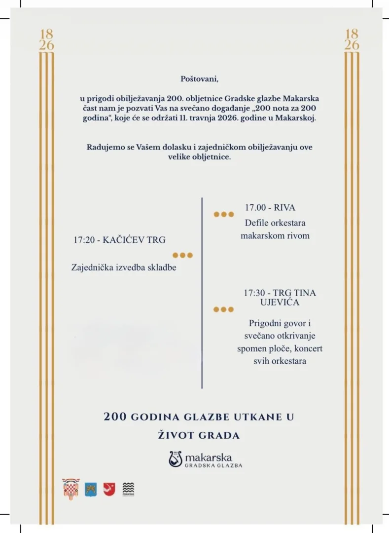 Obilježavanje velikog jubileja, 200 godina djelovanja, započinje sutra, 11. travnja, svečanim defileom kroz grad i zajedničkim koncertom na Trgu Tina Ujevića Gradske glazbe Makarska i gostujućih orkestara: Glazbene udruge BRAssČuta Pučišća, HGD “Biranj” Kaštel Lukšić te Puhačkog orkestra DVD-a Ogulin, čime će Makarska simbolično otvoriti godinu posvećenu svojoj Gradskoj glazbi.