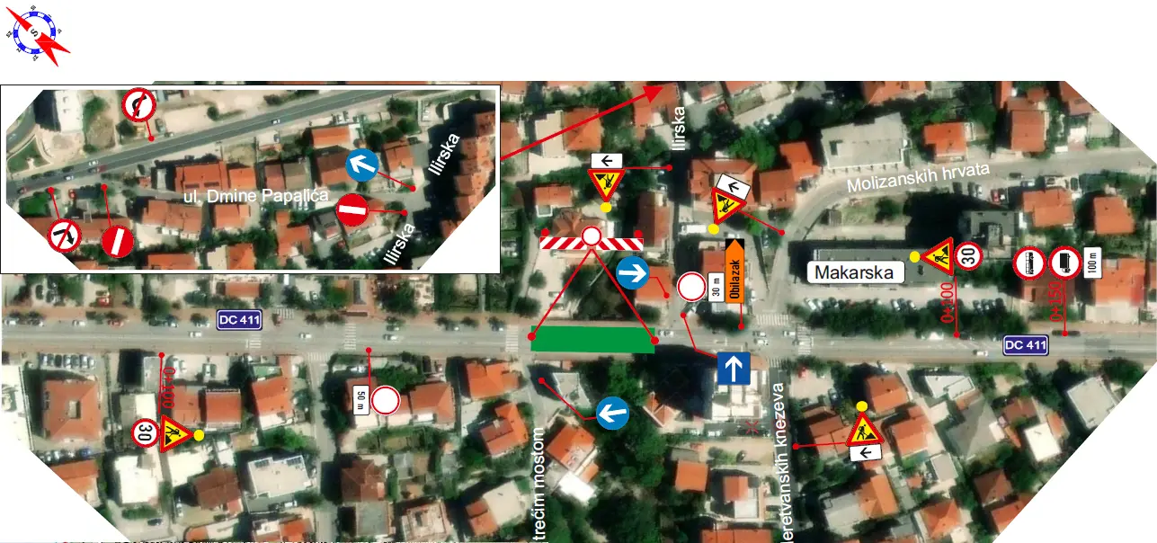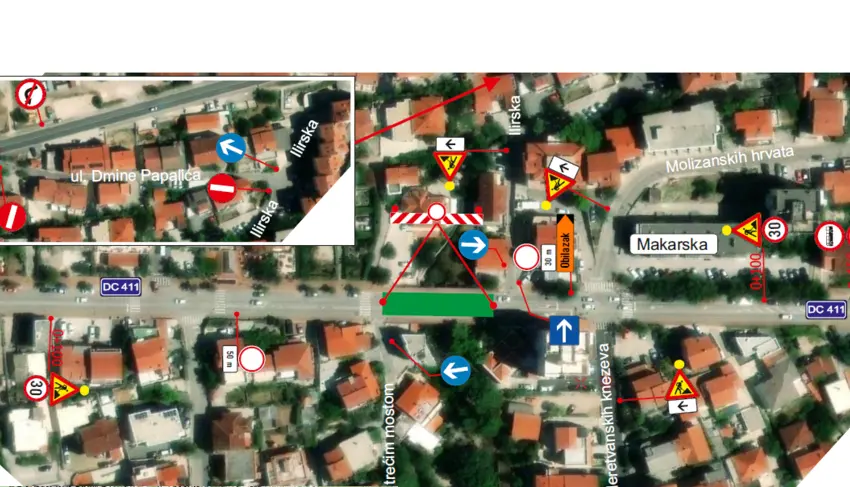 • Obilazni pravac Ilirska ulica (jednosmjerna od grada prema DC8), pa Ulica Dmine Papalića – smjer prema magistrali. Za vrijeme radova Ilirska ulica bit će jednosmjerna u pravcu jug–sjever, a po završetku radova promet će se vratiti u prvobitno stanje.